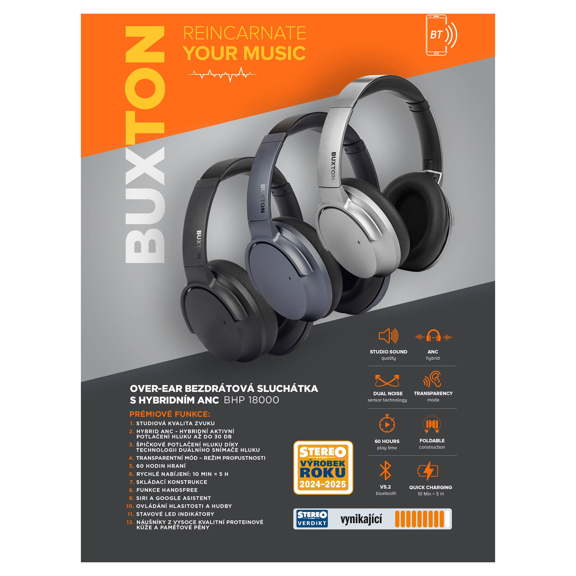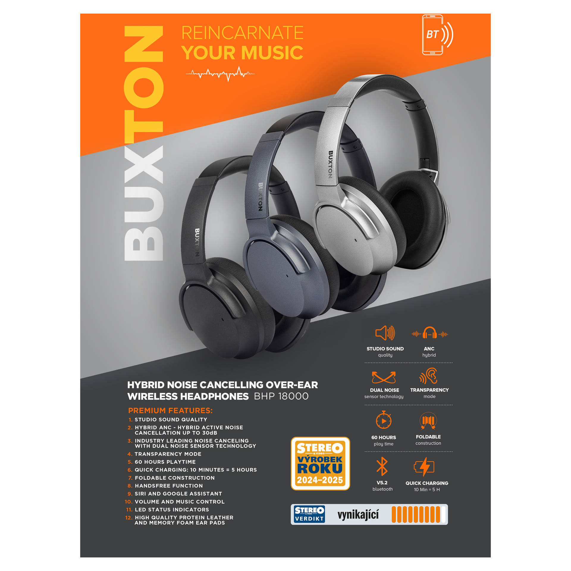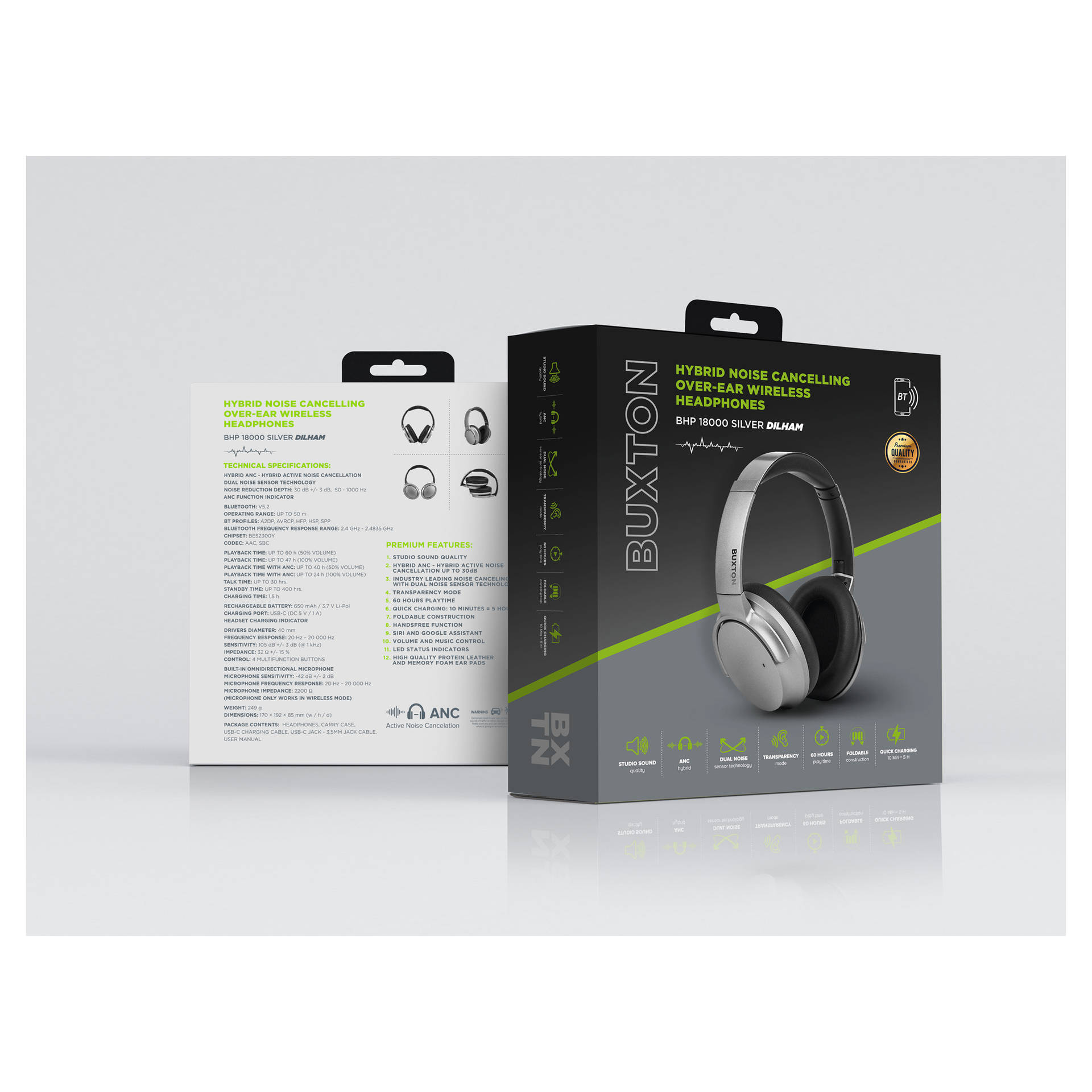 A BUXTON BHP 18000 DILHAM vezeték nélküli fejhallgató stúdióminőségű zenehallgatást biztosít a fejlett Hybrid ANC funkciónak köszönhetően, amely akár 30 dB aktív környezeti zajszűrést is biztosít. A 4 multifunkciós gombbal könnyedén válthat a zene vagy kedvenc podcastja között, és állíthatja a hangerőt. Így nem kell kivennie a telefont a zsebéből. A vezeték nélküli fejhallgató kényelmes viseletét a memóriahabos és proteines bőr fülpárnák biztosítják. Puha és nem nyomja, így ideális mindennapi viselet a városban, sportolás közben, de akár útközben is.