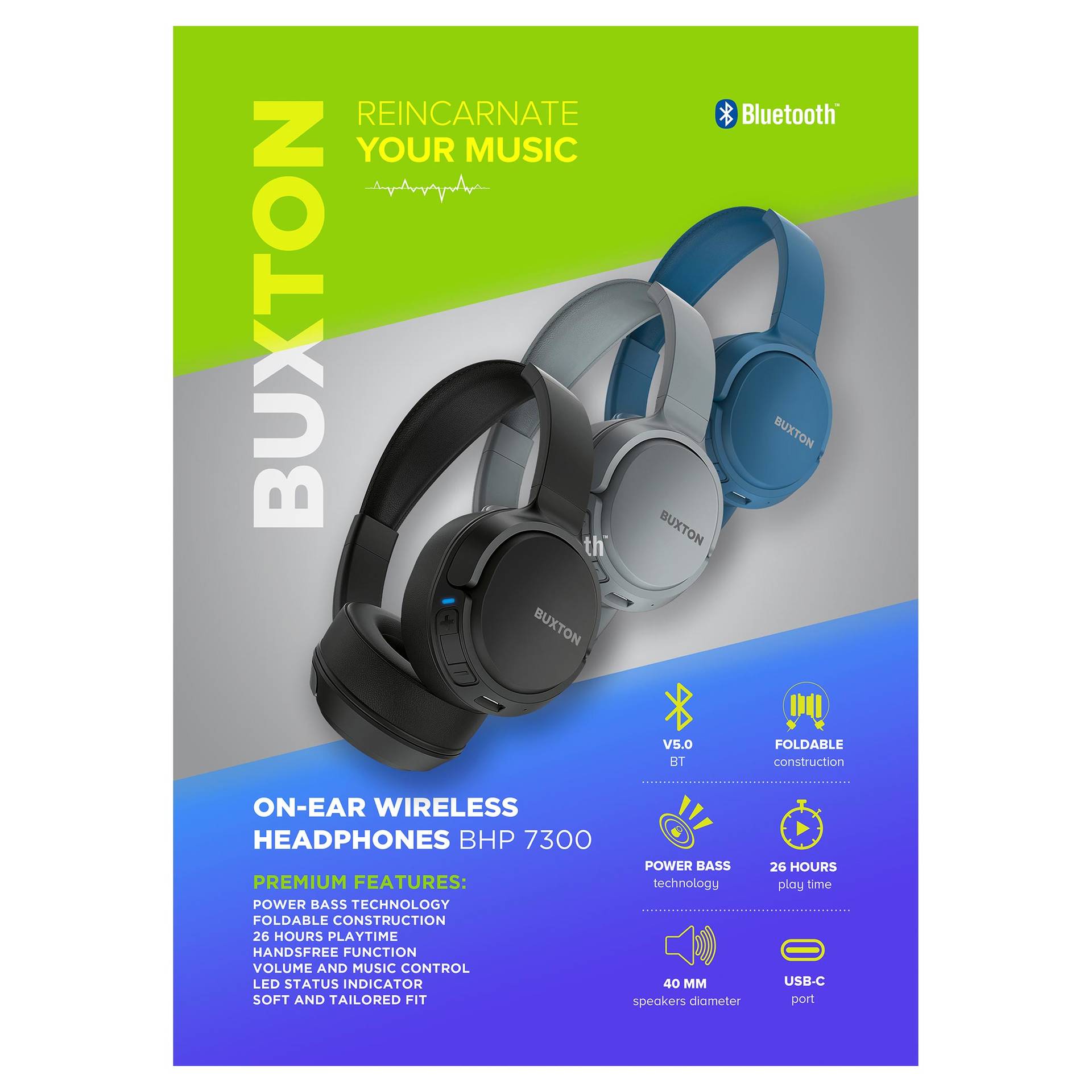 A Buxton BHP 7300 fejhallgató Bluetooth V5.3 BLE segítségével könnyen csatlakoztatható, a forrástól számított 15-méteres hatótávolsággal. Kitűnő a közvetlenül a fejhallgatón található hangerőszabályzó, a beépített mikrofon, a három többfunkciós vezérlőgomb, a kihangosító funkció és a LED-dióda, amely bármikor tájékoztat az akkumulátor szintjéről és a fejhallgató aktuális állapotáról. Az USB-C porton keresztül kevesebb mint két óra alatt feltöltött fejhallgató a kiválasztott maximális hangerőn 40 órán át, félhangerőn pedig akár 55 órán át képes játszani!