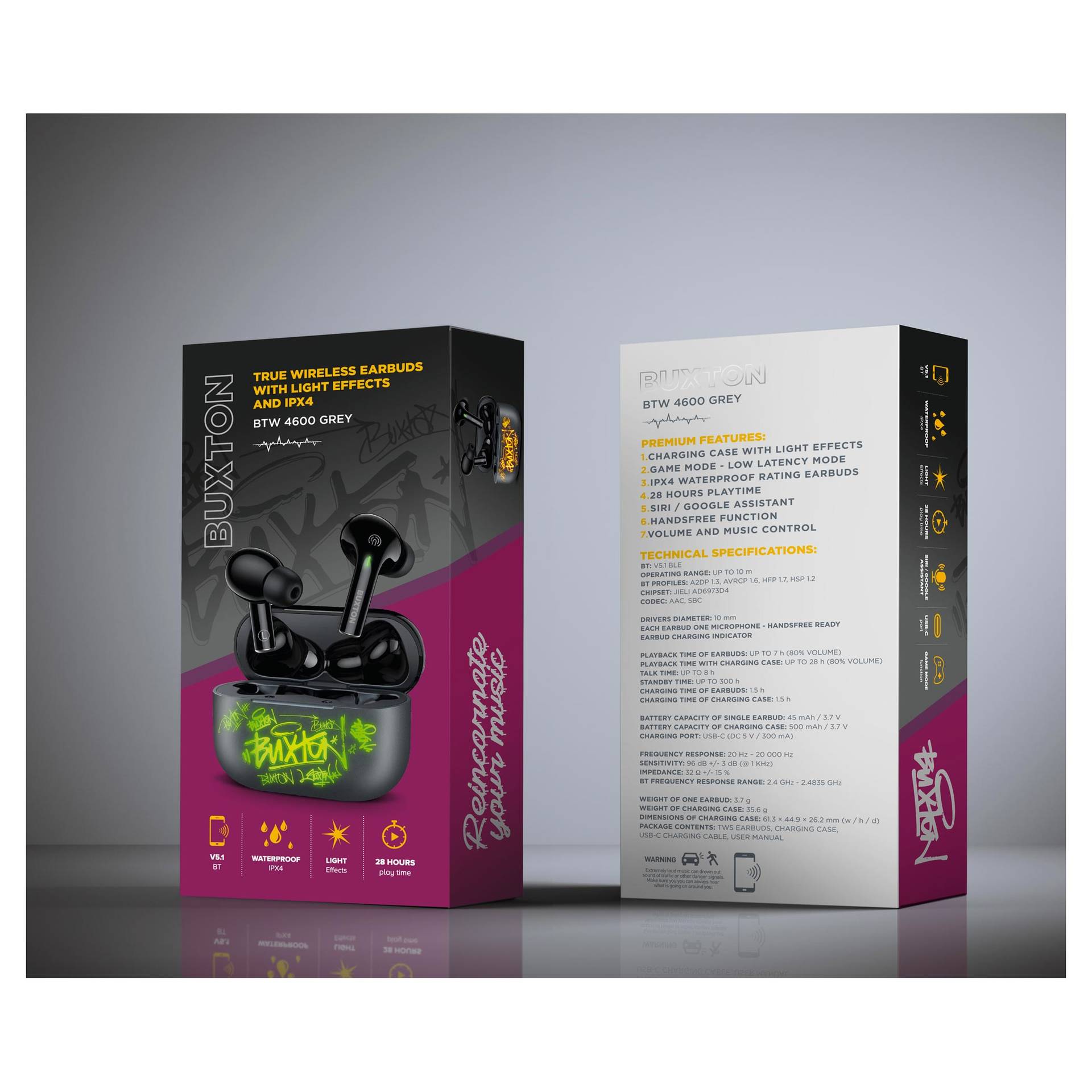 A csomag tartalma: TWS fülhallgatók, USB-C töltőkábel, felhasználói útmutató